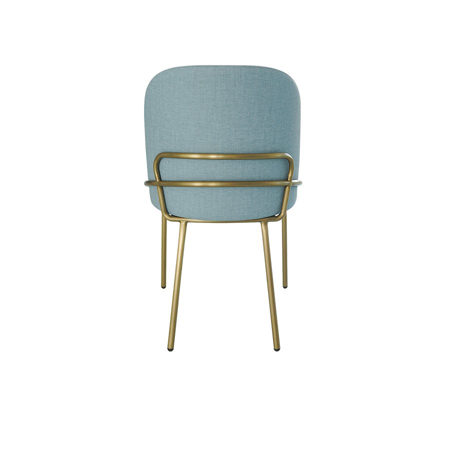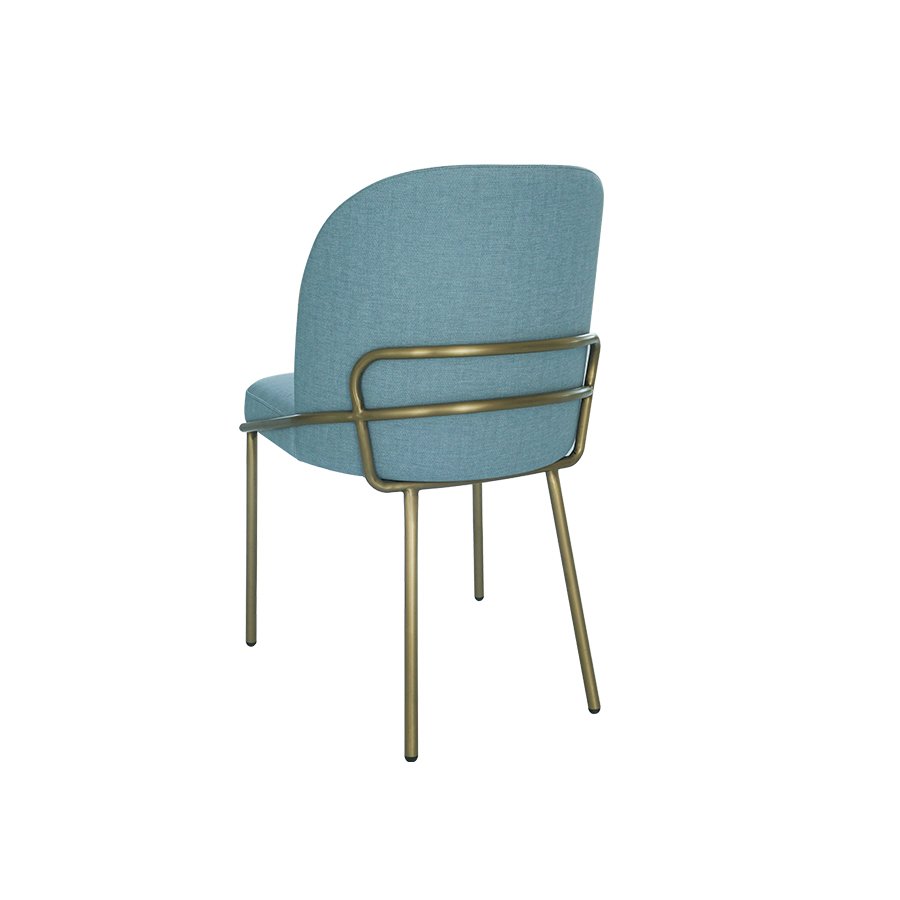 The CH10355 hotel dining chair delivers a refreshing soft-blue tone paired with a sleek champagne-gold metal frame,